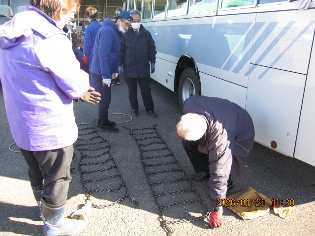 2026年1月29日 チェーン講習を行いました。各自、自分が納得いくまで真剣取り組みました。安全・安心な旅をお届けするために、雪道は「滑るかもしれない」ではなく「滑るもの」としてハンドルを握る。雪道に不意打ちはありません。確実な点検と準備は絶対事項。現場で慌てないための準備が、運転席での冷静な判断を支えます。